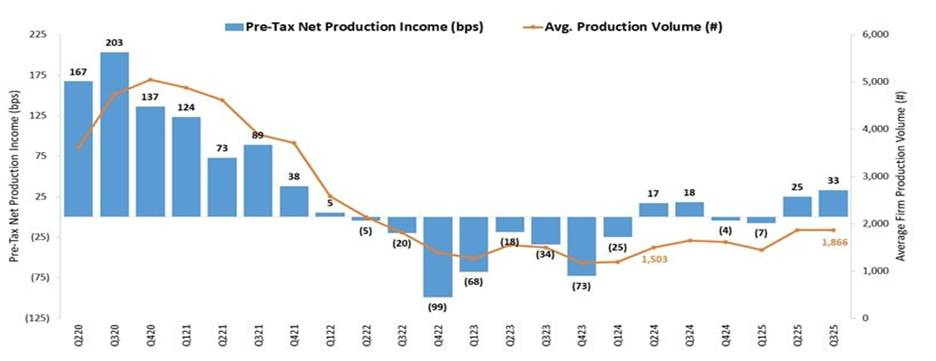 The mortgage industry proved in 2020 and 2021 (and in other refinance boom periods) that it can scale up rapidly and be very profitable when there is massive growth in volume. In my 30 years of experience in this business,[6] however, that never seems to work in the other direction. That is, when volumes decline, the industry is unable to quickly scale downward in its costs.[7] The story for nearly the last 4 years is that breaking even or losing money just to stay in business is the new normal.[8] The graph below from the MBA’s Third Quarter 2025 Quarterly Mortgage Bankers Performance Report shows how this relationship of profits to loan volume looks to people who like charts.[9]